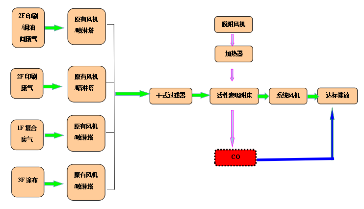 根據(jù)該公司的要求及我司有機(jī)廢氣的治理經(jīng)驗(yàn),采用干式過濾、活性炭吸附處理有機(jī)廢氣,活性炭吸附飽和以后采用CO催化氧化裝置對其進(jìn)行脫附。