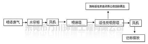 根據(jù)廠方提供的資料及現(xiàn)場勘察的情況。其噴漆廢氣的來源主要為無塵噴漆車間內(nèi)的5條自動(dòng)噴涂線。在生產(chǎn)過程中有噴漆,該工序產(chǎn)生了一定量含三苯有機(jī)廢氣和噴漆粉塵,該廢氣不僅對環(huán)境造成污染,而且對人體有較大的危害作用,同時(shí)也破壞了周邊的環(huán)境,造成了不良的影響,需進(jìn)行處理后排放。我們工程師分析了該廢氣的特點(diǎn)和以往的案例經(jīng)驗(yàn),采用了“水簾柜+噴淋塔+活性炭吸附塔”這套解決方案。