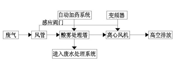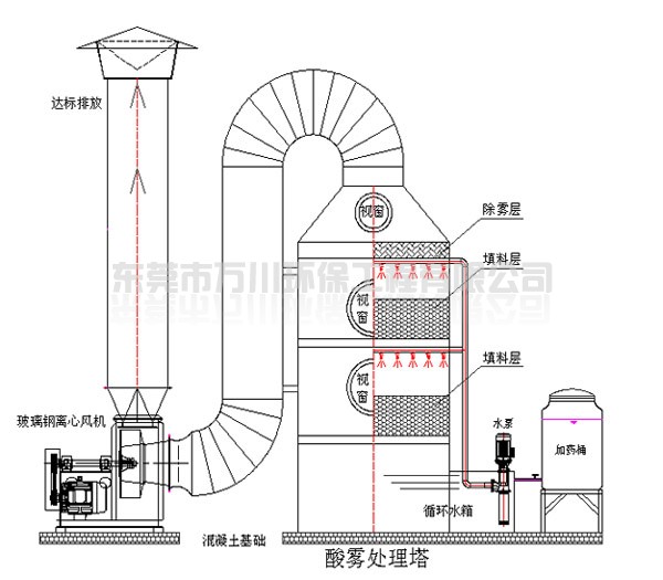酸霧廢氣由風(fēng)管進(jìn)入酸霧處理塔,自下而上穿過(guò)填料層;循環(huán)堿液吸收劑由塔頂通過(guò)螺旋噴嘴,形成的水霧勻地噴淋到填料層中,沿著填料層表面向下流動(dòng),進(jìn)入循環(huán)水箱。由于上升氣流和下降霧化吸收劑(堿液)在填料中不斷接觸,上升氣體中流質(zhì)的濃度越來(lái)越低。使其酸霧得到凈化,達(dá)標(biāo)排放。
